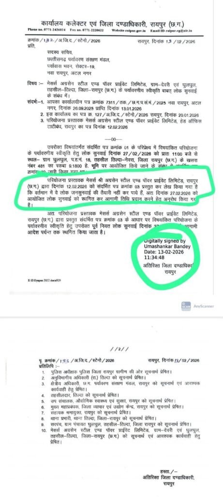 परियोजना से संबंधित जनसुनवाई 27 फरवरी 2026 को प्रस्तावित थी, जिसे प्रशासनिक निर्देश पर आगामी आदेश तक स्थगित कर दिया गया है। इस निर्णय को ग्रामीण अपनी आपत्ति का असर मान रहे हैं, हालांकि प्रशासन की ओर से आधिकारिक रूप से कारण स्पष्ट नहीं किया गया है।
