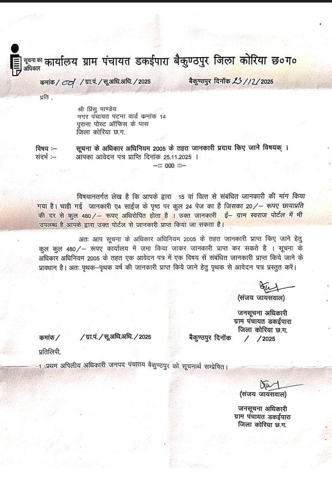 koriya. पारदर्शिता और जवाबदेही के बड़े-बड़े दावे करने वाली पंचायत व्यवस्था अब खुद सवालों के घेरे में है। मामला ग्राम पंचायत डकईपारा का है, जहां सूचना का अधिकार अधिनियम के तहत मांगी गई जानकारी को न सिर्फ तय समयसीमा के बाद भी रोके रखा गया, बल्कि प्रथम अपील के आदेश के बावजूद आवेदक पर ₹20 प्रति पेज की दर से ₹480 वसूलने का फरमान सुना दिया गया। यह केवल नियमों की अनदेखी नहीं, बल्कि कानून को खुली चुनौती जैसा प्रतीत हो रहा है।